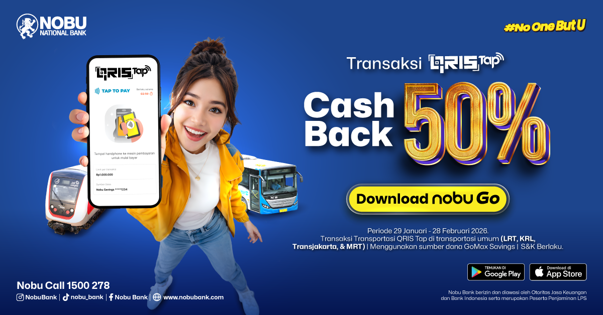 - Cashback akan dikreditkan ke rekening sumber dana Nasabah (GoMax Savings) secara real time setelah Nasabah berhasil melakukan Tap Out menggunakan QRIS Tap nobu Go.