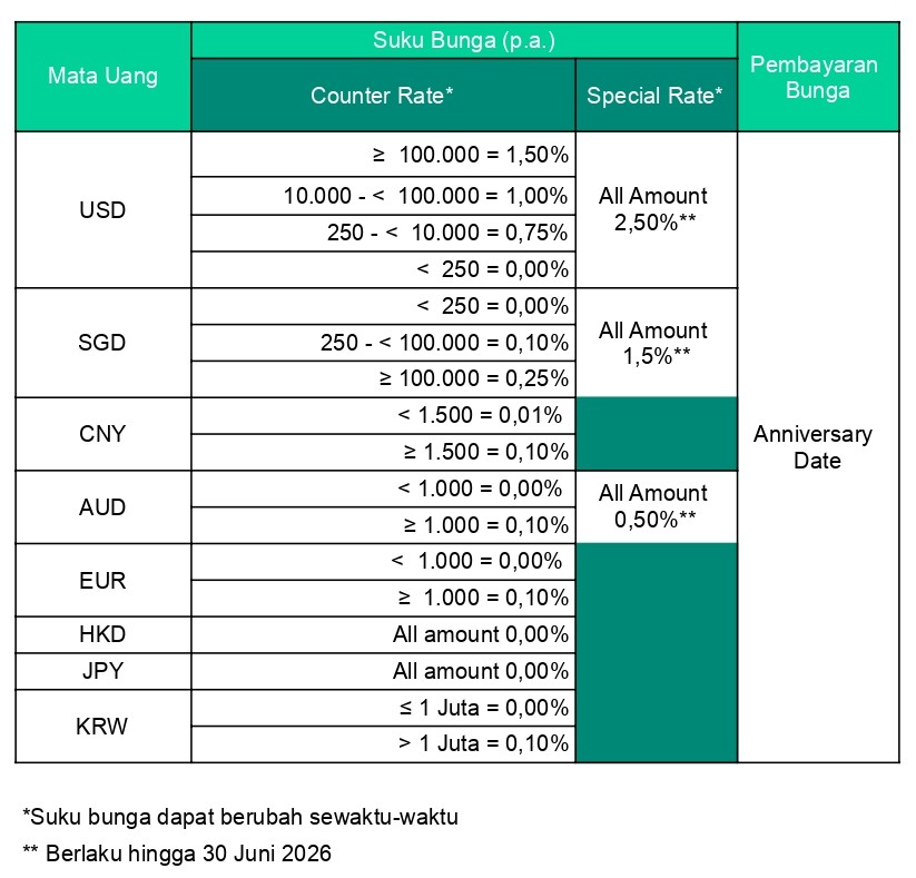Periode berlaku special rate. USD, SGD & AUD: efektif berlaku mulai 24 Februari – 30 Juni 2026