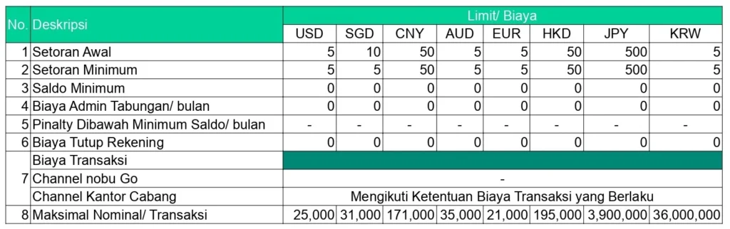 Maksimum setoran awal tidak lebih besar dari equivalent USD 100.000,-secara akumulasi transaksi valas di all channel Nobu Bank.