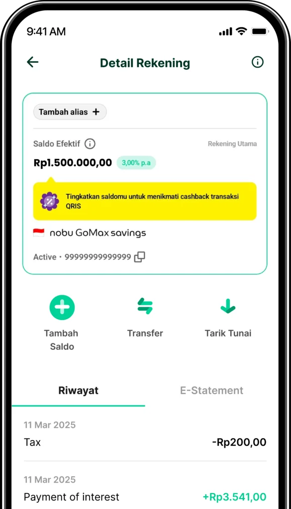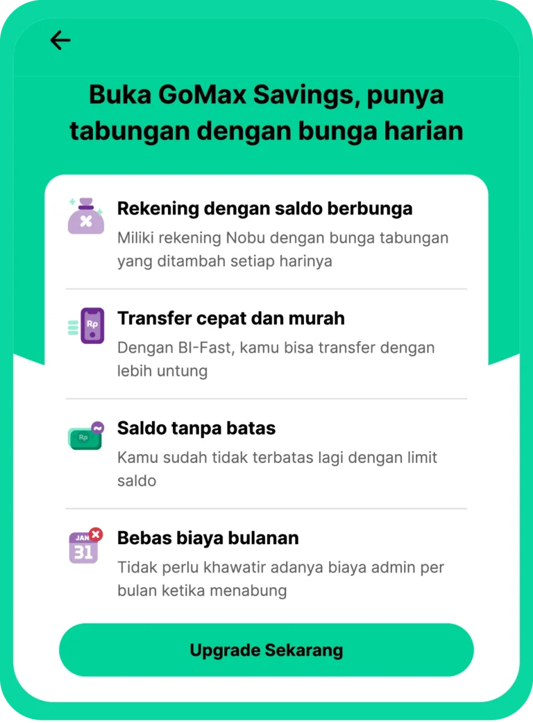 GoMax Savings dari Nobu Bank adalah solusi menabung yang cerdas bagi siapa saja yang ingin mendapatkan bunga kompetitif tanpa perlu menunggu lama. Dengan bunga flat 3% p.a. yang dibayarkan setiap hari, kamu bisa merasakan keuntungan secara langsung dan meningkatkan saldo tabunganmu dengan lebih cepat. Jadi, jika kamu sedang mencari cara untuk menabung lebih efektif dan mendapatkan cuan harian, GoMax Savings dari Nobu Bank bisa menjadi pilihan yang tepat.